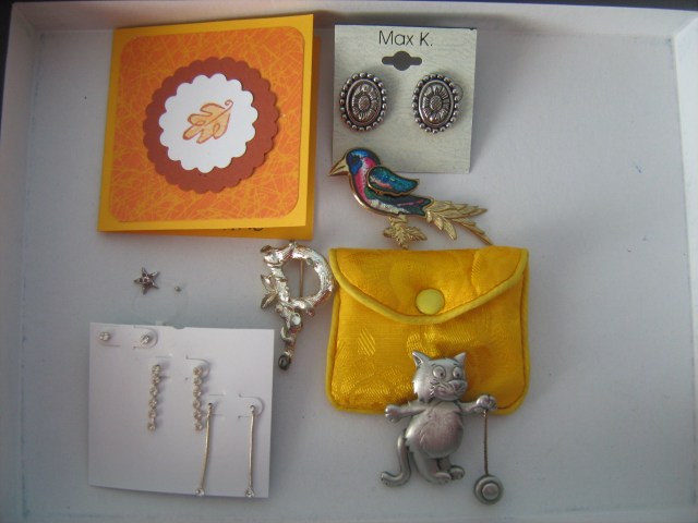 Adrienne mi-a trimis un asa zis cadou “vintage” cu ceea ce se vede mai jos: brose, cercei si o felicitare handmade.